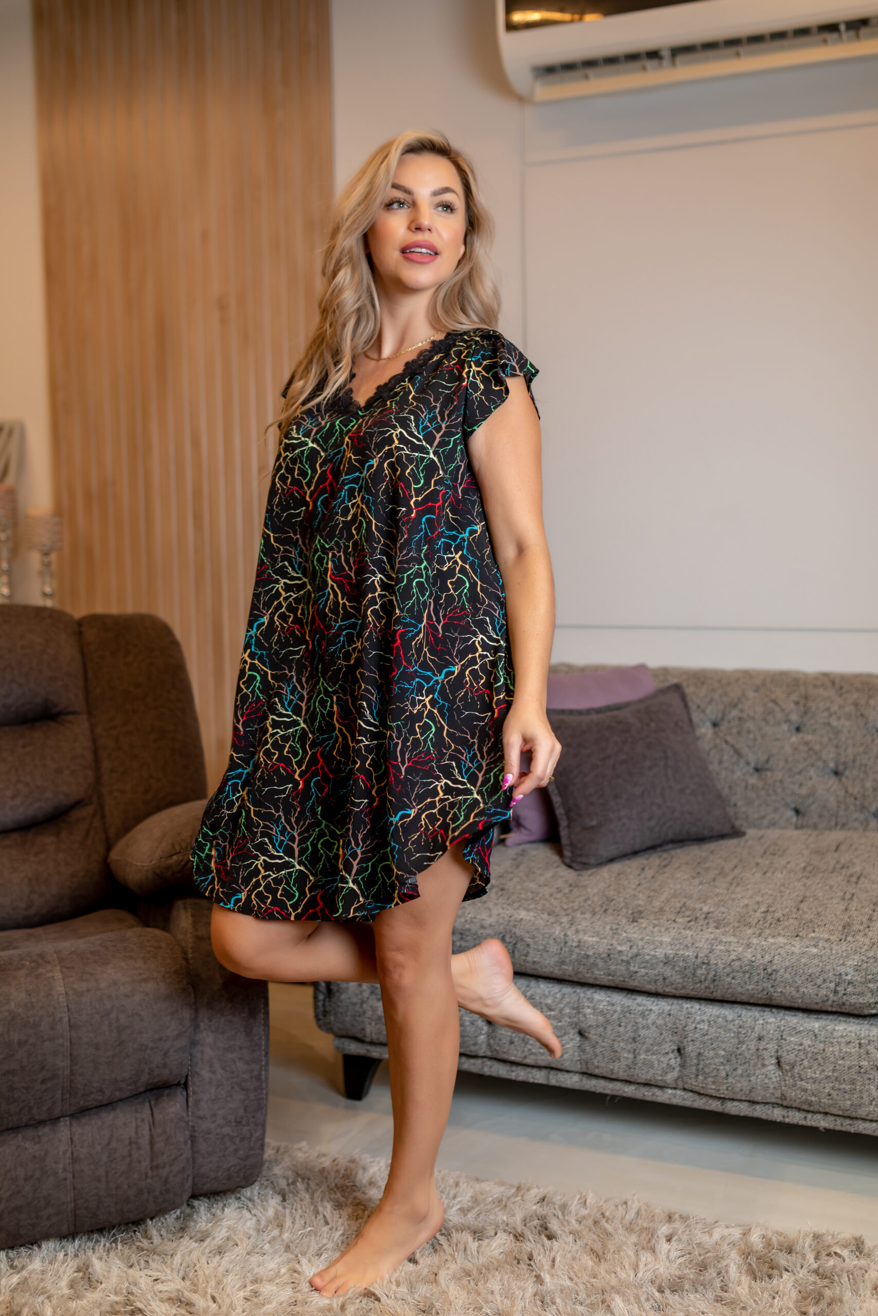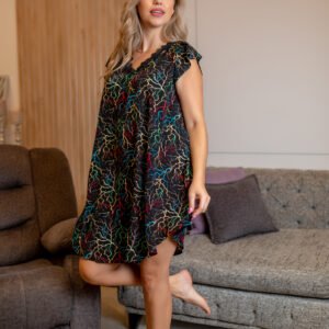 Bring bold color and comfort to your everyday wardrobe with the Color Splash Lounge Dress – where playful design meets effortless style. This relaxed-fit dress features fluttery cap sleeves and a lace-trimmed V-neckline that adds a soft, feminine touch. The bold, brushstroke pattern combines vibrant shades of red, yellow, teal, and blue, making it an instant statement piece.